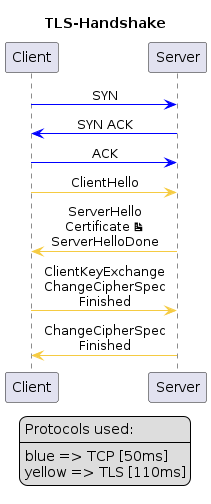 @startuml title **TLS-Handshake** participant Client as c participant Server as s skinparam sequenceMessageAlignment center c -[#blue]> s: SYN s -[#blue]> c: SYN ACK c -[#blue]> s: ACK c -[#f5cb42]> s: ClientHello s -[#f5cb42]> c: ServerHello\nCertificate <&document>\nServerHelloDone c -[#f5cb42]> s: ClientKeyExchange\nChangeCipherSpec\nFinished s -[#f5cb42]> c: ChangeCipherSpec\nFinished legend Protocols used: ---- blue => TCP [50ms] yellow => TLS [110ms] end legend @enduml